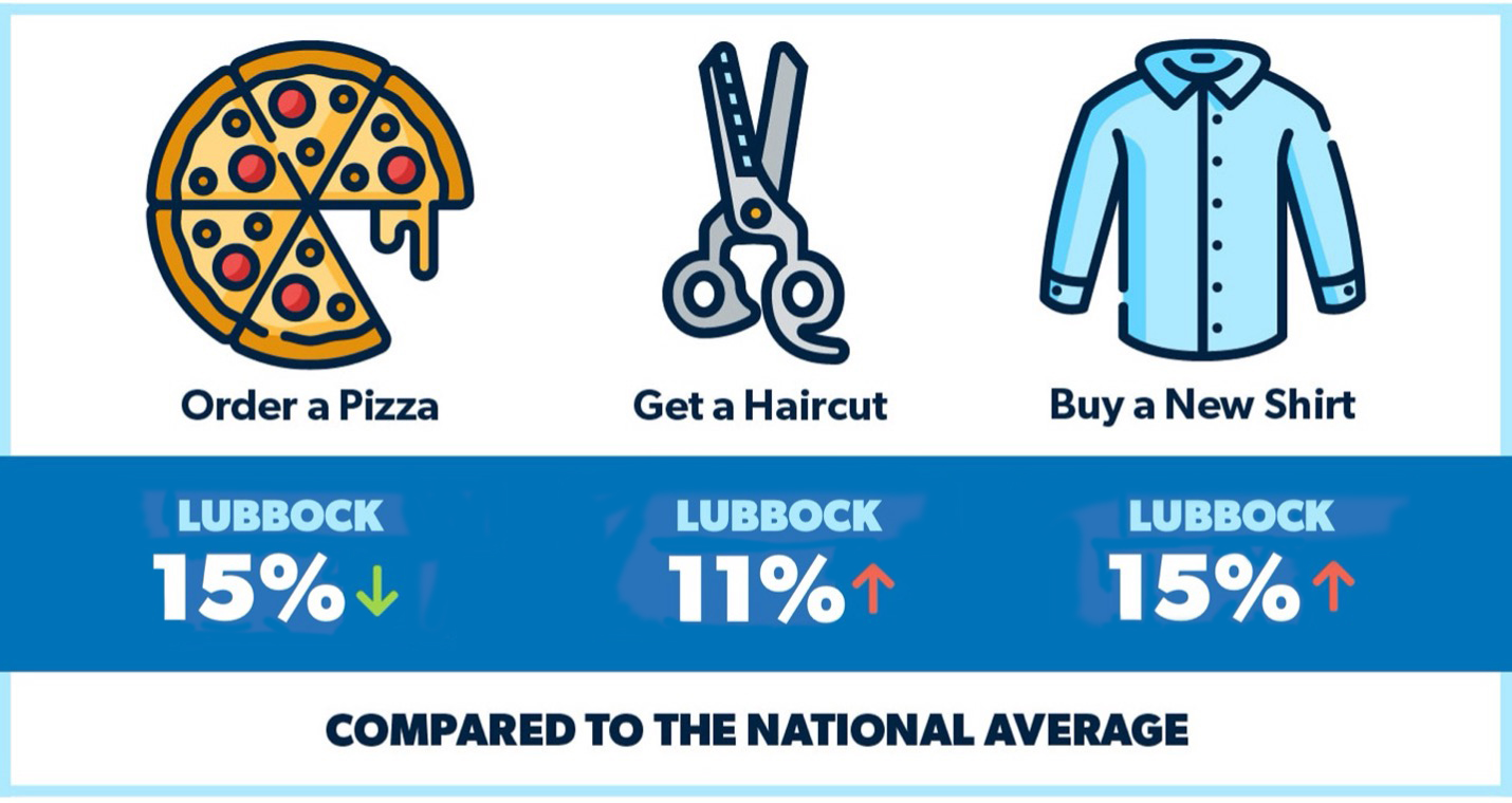 Lubbock, the “Hub City” and birthplace of Buddy Holly, represents the median of Texas cities for miscellaneous costs—3% lower than the national average. In Lubbock, you can order a pizza for $11, get a haircut for $31, and buy a shirt for $45. For reference, those prices are $13, $28 and $39 for the average U.S. city, respectively.