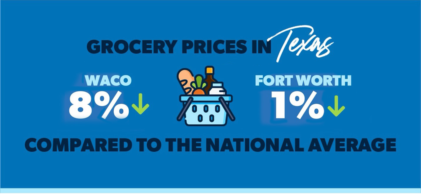 Grocery prices in Texas have a much narrower range—in a good way. No matter where you land, they’re going to be at least slightly below the national average. That’s right . . . no Texas city on the COLI list has higher-than-average grocery prices! They range from 8% lower than the national average in Waco to 1% lower in Fort Worth.