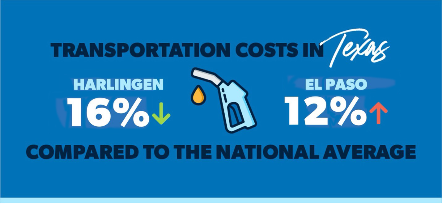 Rev up your engines! Texas transportation costs range from 16% lower than the national average in Harlingen to 12% higher in the border city of El Paso. Fort Worth slides into the middle range for transportation costs among most Texas cities, which is 8% lower than the national average.