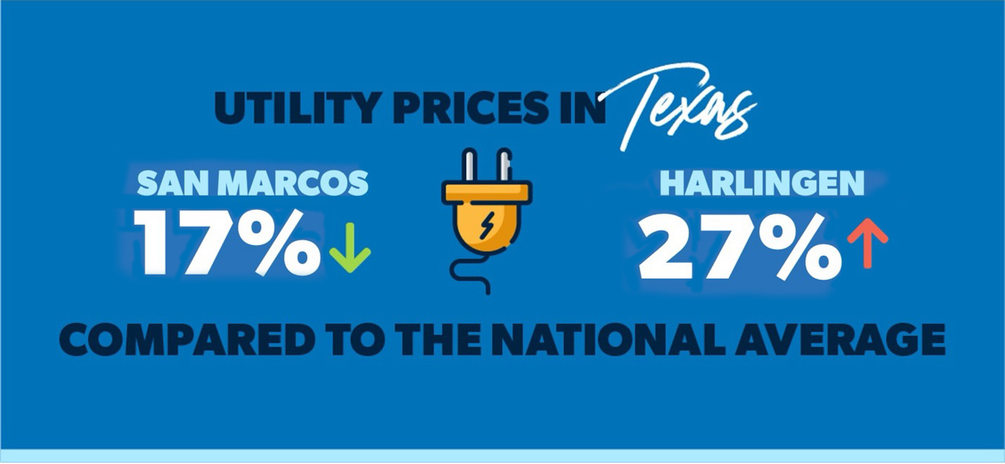 Utility costs like energy and phone service in Texas range from 17% lower than the national average in San Marcos to 27% higher in Harlingen. Denton is somewhere in the middle range among Texas cities for utility costs at 1% higher than the national average.